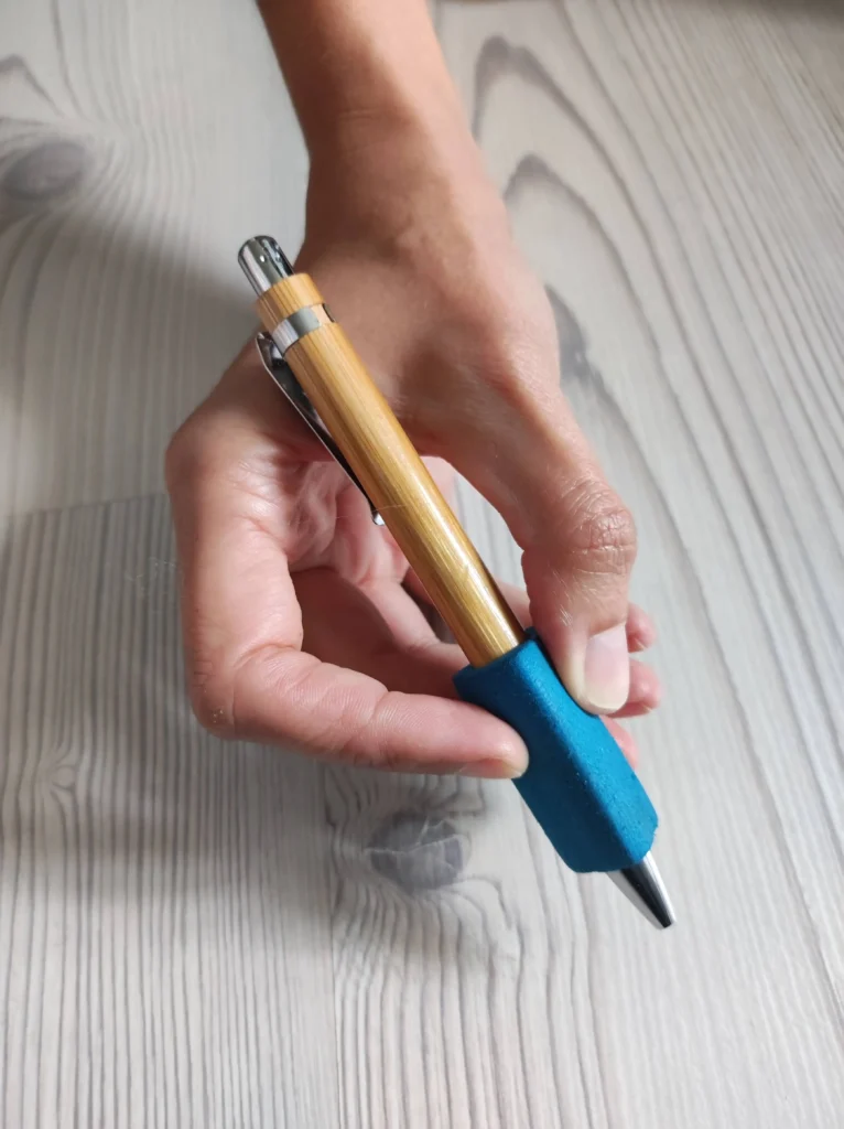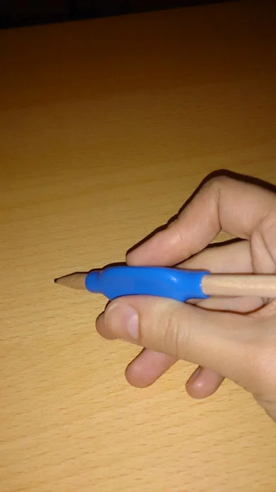 Ich benutze einen dreieckigen Griff aus Kunststoff oder Schaumstoff, der passgenau auf meinen genormten Bleistift oder einen dünnen Kugelschreiber aufgesetzt werden kann. Er liegt angenehm und sicher in meiner Hand, sodass ich beim Schreiben oder Zeichnen nicht abrutsche. Durch die ergonomische Form ermüdet meine Hand auch bei längeren Schreibphasen weniger schnell und es entstehen nicht so schnell Druckstellen.