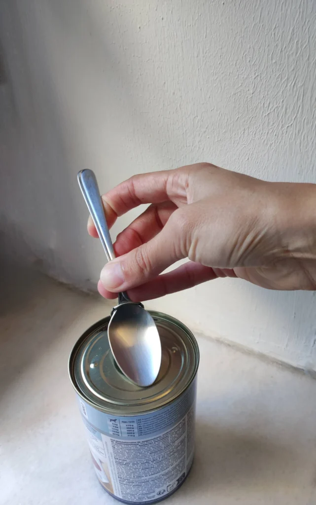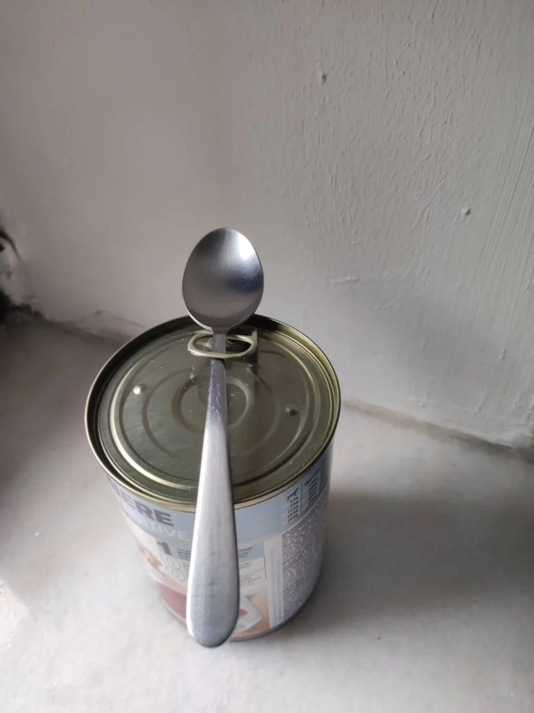 Wer eine kostengünstigere Methode sucht, geht folgendermaßen vor: Ich halte die Dose fest auf einer stabilen Unterlage, suche den Verschlussring, stecke den Stiel eines Löffels hindurch und hebele den Ring samt Deckel vorsichtig nach oben, bis sich der Deckel löst.