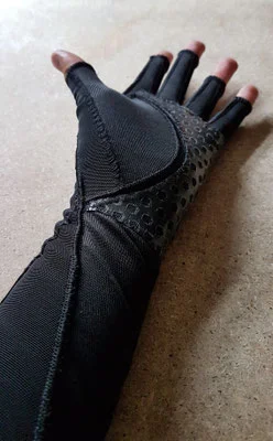 5. Das Material zwischen den Fingern und dem Daumen ist sehr glatt, sodass mir Stifte oder ähnliche Gegenstände ständig aus der Hand rutschen. Auf meinen Wunsch hin wurde der Handschuh mit einer Silikonschicht zwischen den Fingern nachgebessert, eine wirkliche Verbesserung habe ich dadurch aber leider nicht bemerkt.